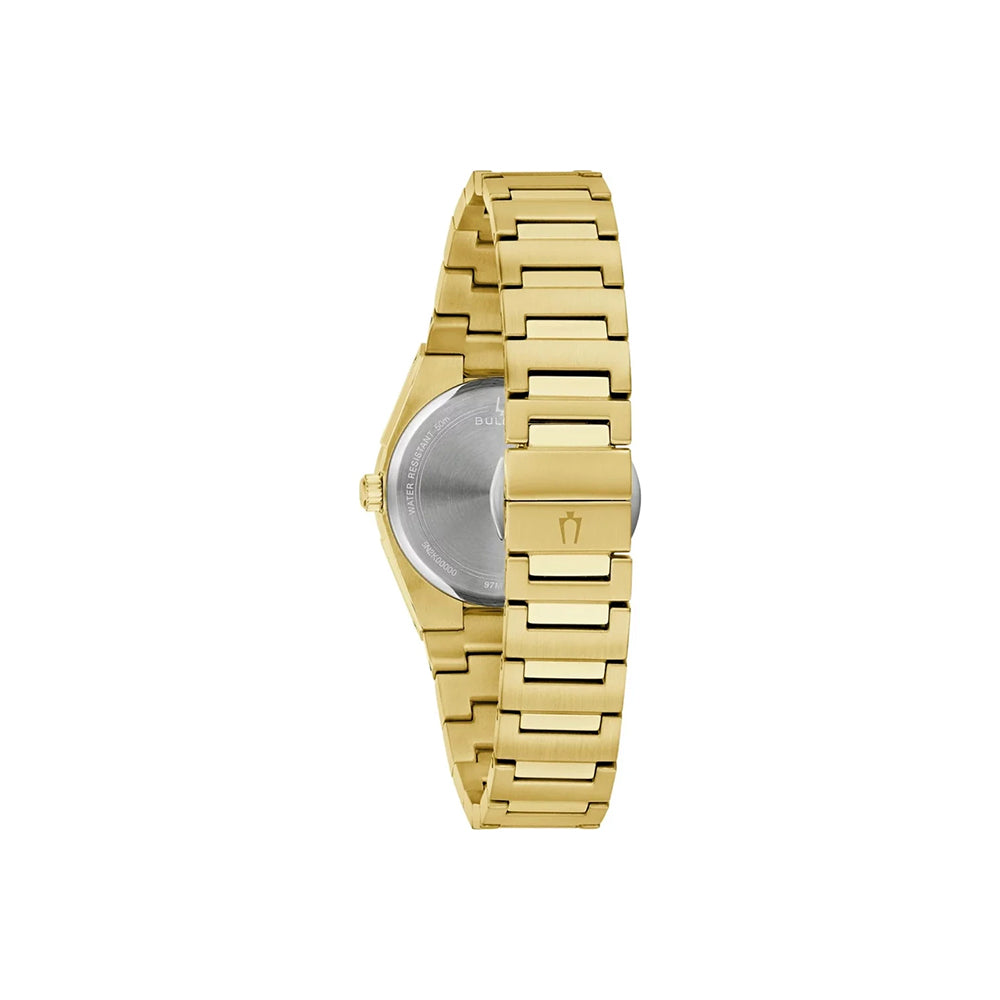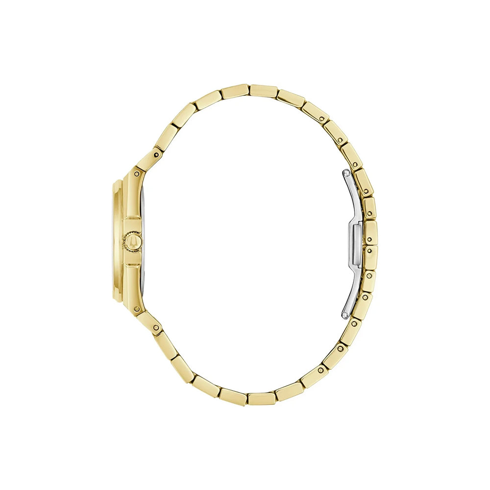 Die Bulova Classic verfügt über ein 18 mm breites Edelstahlarmband in Gold mit Schmetterlingsschließe. Die hochwertige Verarbeitung sorgt für sicheren Halt und angenehmen Sitz am Handgelenk. Dank der flachen Gehäusehöhe von 7,35 mm trägt sich die Bulova Classic besonders komfortabel und elegant unter Blusen oder Blazern.