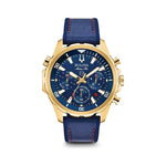 Das blaue Armband aus Leder der Bulova Classic Herrenuhr (Artikelnummer: 97B168) mit Silikon-Elementen und roten Nähten sorgt für einen angenehmen Tragekomfort. Die Dornschließe gewährleistet eine einfache Anpassung und sicheren Halt. Mit einem Gehäusedurchmesser von 43 mm und einer Gehäusehöhe von 11,8 mm trägt sich die Uhr leicht und komfortabel am Handgelenk.