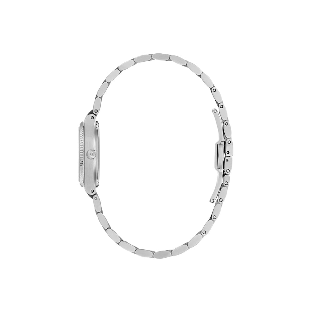 Die Bulova Super Seville verfügt über ein 18 mm breites Edelstahlarmband in Silber mit Faltschließe und Druckknöpfen. Dank ihres geringen Gewichts von 64,5 g und einer schlanken Gehäusehöhe von 7,6 mm trägt sich die Bulova Super Seville besonders angenehm und unaufdringlich am Handgelenk. Das massive Edelstahlband sorgt für Stabilität, während die kompakte Größe perfekten Sitz garantiert.