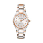 Die Bulova Sutton Automatik (Artikelnummer: 98L313) ist eine modische Damenarmbanduhr, die mit ihrem eleganten Design und den hochwertigen Materialien überzeugt. Das polierte Edelstahlgehäuse in Roségold und Silber verleiht ihr einen zeitlosen Charme.