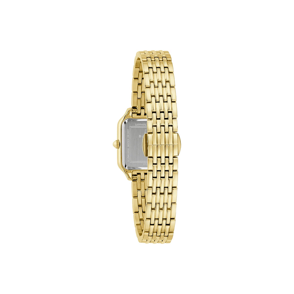 Die Bulova Sutton vereint quadratische Eleganz mit goldfarbener Ausstrahlung und klassischer Analoganzeige. Mit Saphirglas, präzisem Quarzwerk und stilvollem Edelstahlarmband ist die Bulova Sutton eine Damenuhr, die zeitlose Klasse und moderne Zurückhaltung perfekt kombiniert.
