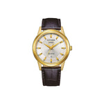 Die Citizen AW0102-13AC ist eine stilvolle Herrenuhr, die klassischen Charakter mit moderner Solar-Technologie verbindet. Mit ihrem goldfarbenen Edelstahlgehäuse, dem silbernen Zifferblatt und dem braunen Lederarmband wirkt die Citizen AW0102-13AC elegant, hochwertig und absolut zeitlos – ein echter Begleiter für jeden Tag.