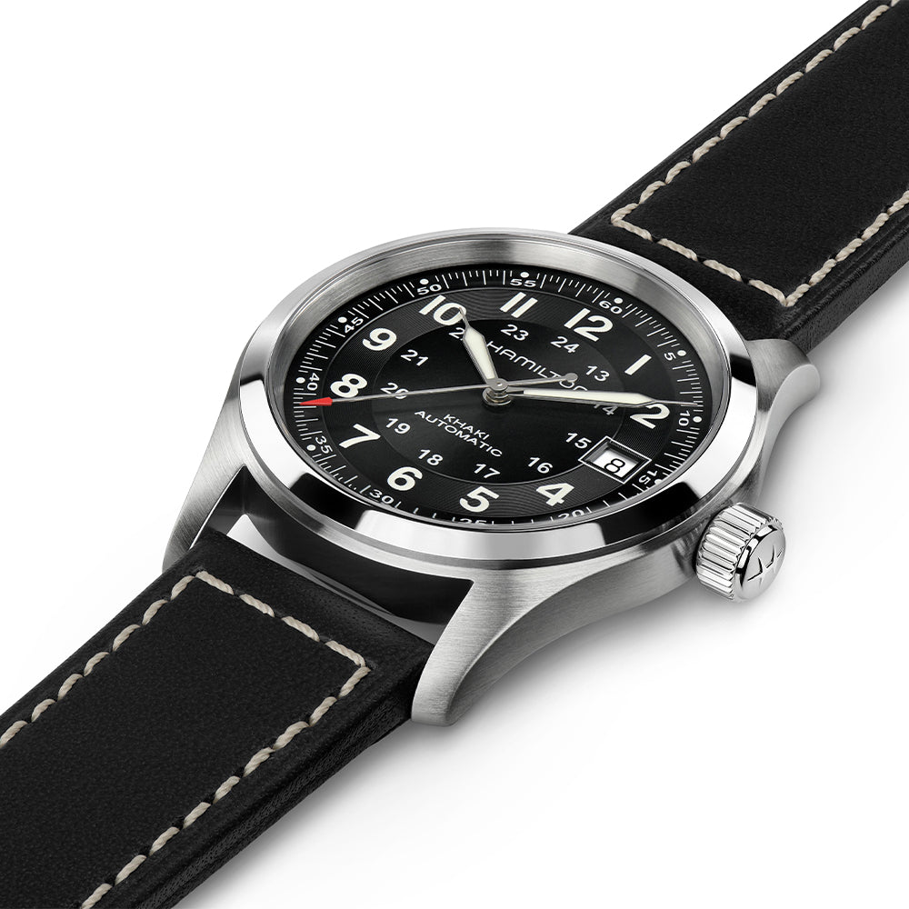Das Rindlederarmband und die kompakte Größe machen das Tragen der Khaki Field äußerst angenehm, sowohl im Alltag als auch bei längeren Abenteuern.
