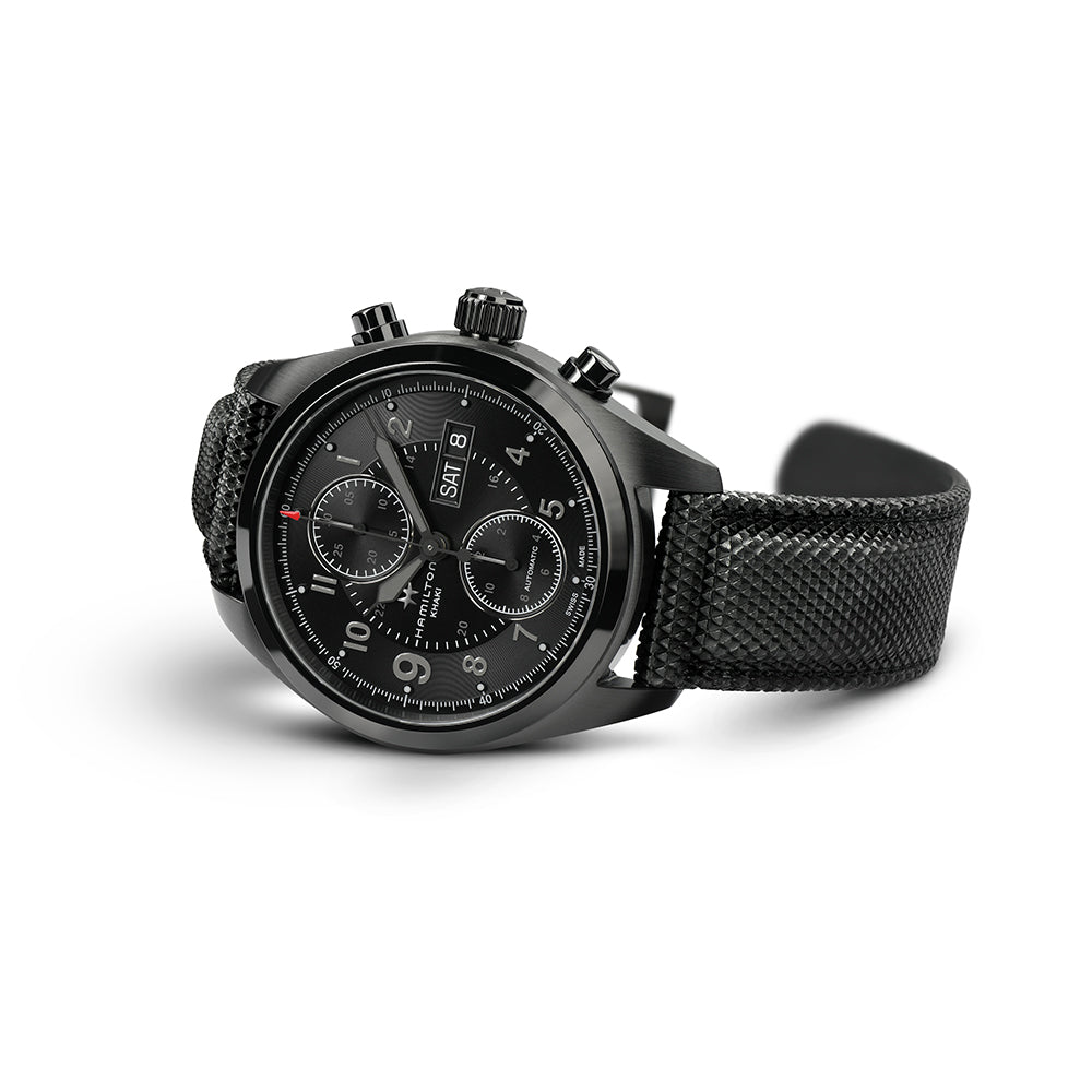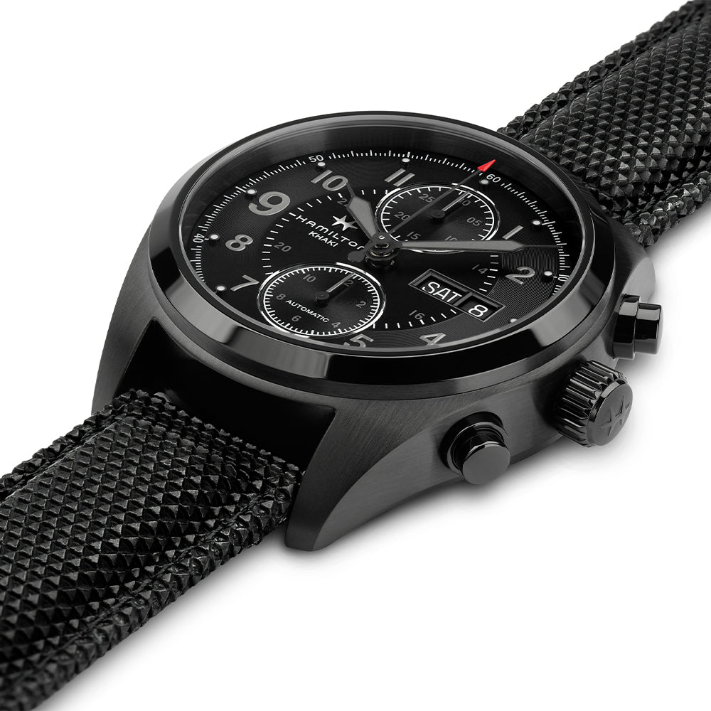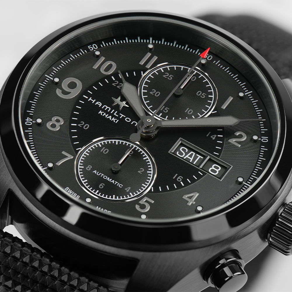 Die Hamilton Khaki Field Auto Chrono bietet außergewöhnlichen Tragekomfort dank ihres ergonomischen Designs und der hochwertigen Materialien. Das Edelstahlgehäuse mit schwarzer PVD-Beschichtung und das Saphirglas garantieren eine langlebige und stilvolle Nutzung. Die Dornschließe sorgt für eine sichere und bequeme Passform am Handgelenk, was diese Uhr zu einem perfekten Begleiter für sowohl Abenteuer als auch den Alltag macht.