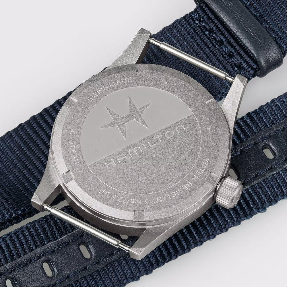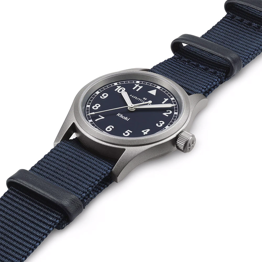 Die Hamilton Khaki Field Quartz bietet nicht nur ein ästhetisches Design, sondern auch höchsten Tragekomfort. Das leichte Edelstahlgehäuse und das flexible NATO-Textilarmband sorgen für ein angenehmes Tragegefühl den ganzen Tag über. Die Dornschließe garantiert sicheren Halt, während die schlanke Bauhöhe von nur 7,55 mm für unauffälligen Komfort sorgt.