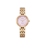 Die Citizen EM0993-82X ist ein wahres Meisterstück, das Eleganz und Nachhaltigkeit in einem einzigartigen Design vereint. Das goldplattierte Gehäuse und das zarte lightrosé Zifferblatt verleihen ihr eine feminine Ausstrahlung, während die Eco-Drive-Technologie für eine umweltfreundliche und zuverlässige Zeitmessung sorgt. Mit Saphirglas, 5-bar-Wasserdichtigkeit und hochwertigem Edelstahl ist sie ein stilvolles Accessoire für Frauen mit Sinn für Qualität und Exklusivität.