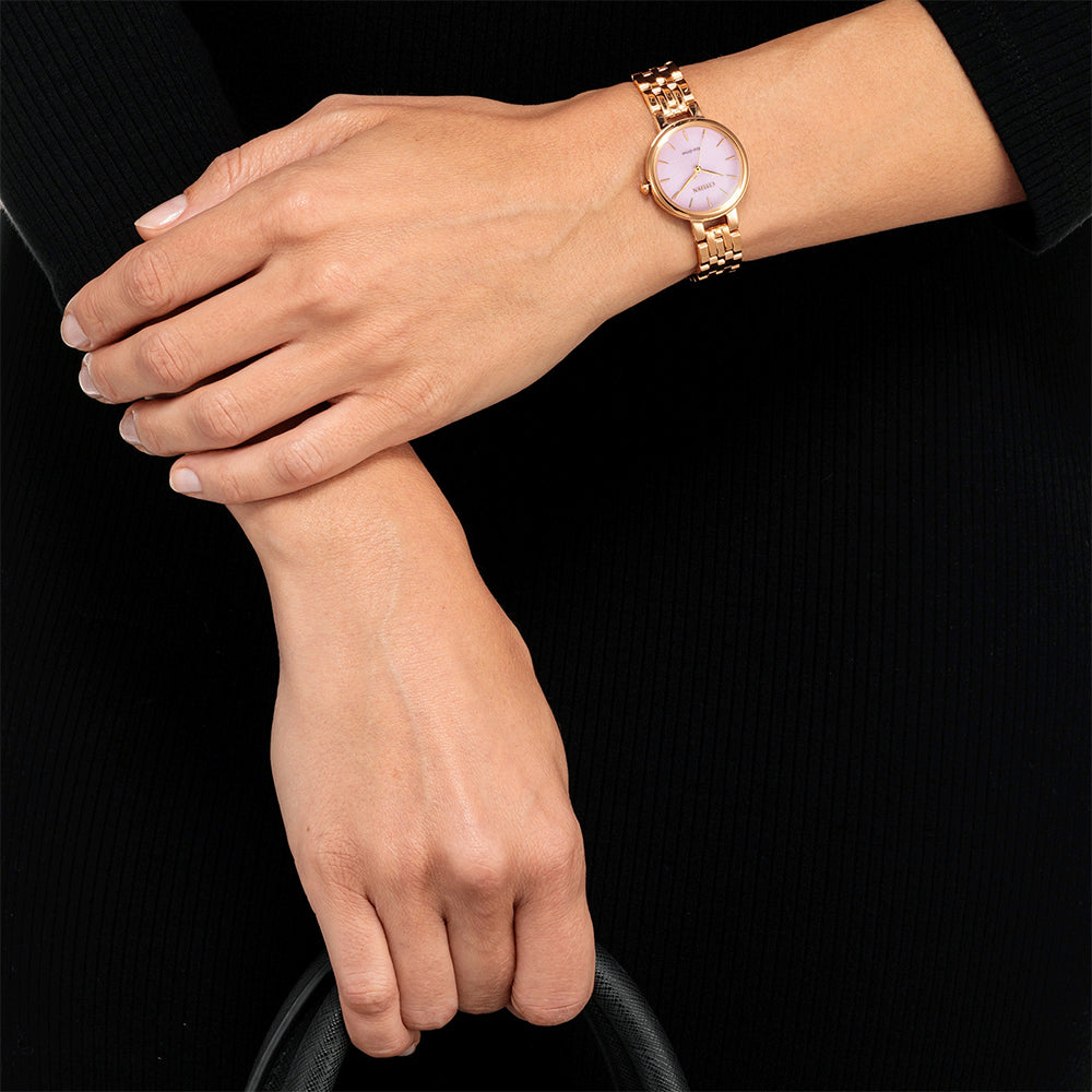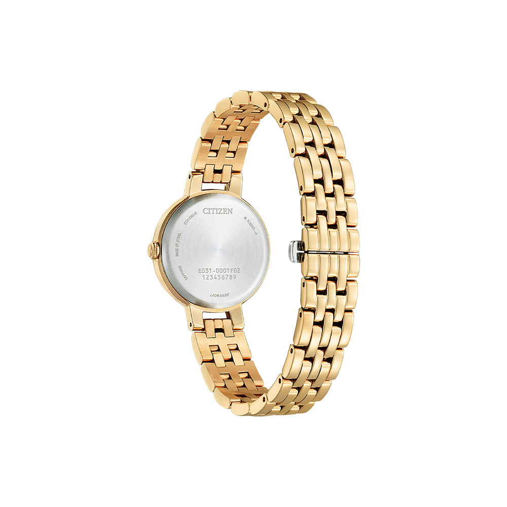 Die Citizen EM0993-82X überzeugt nicht nur durch ihre edle Optik, sondern auch durch ihren angenehmen Tragekomfort. Das massive Edelstahlarmband in Gold passt sich sanft dem Handgelenk an und bietet mit seiner stabilen Verarbeitung ein sicheres Gefühl. Mit einem leichten Gewicht von nur 59 g bleibt die Uhr den ganzen Tag über angenehm tragbar – sei es im Büro, beim Abendessen oder bei besonderen Anlässen.