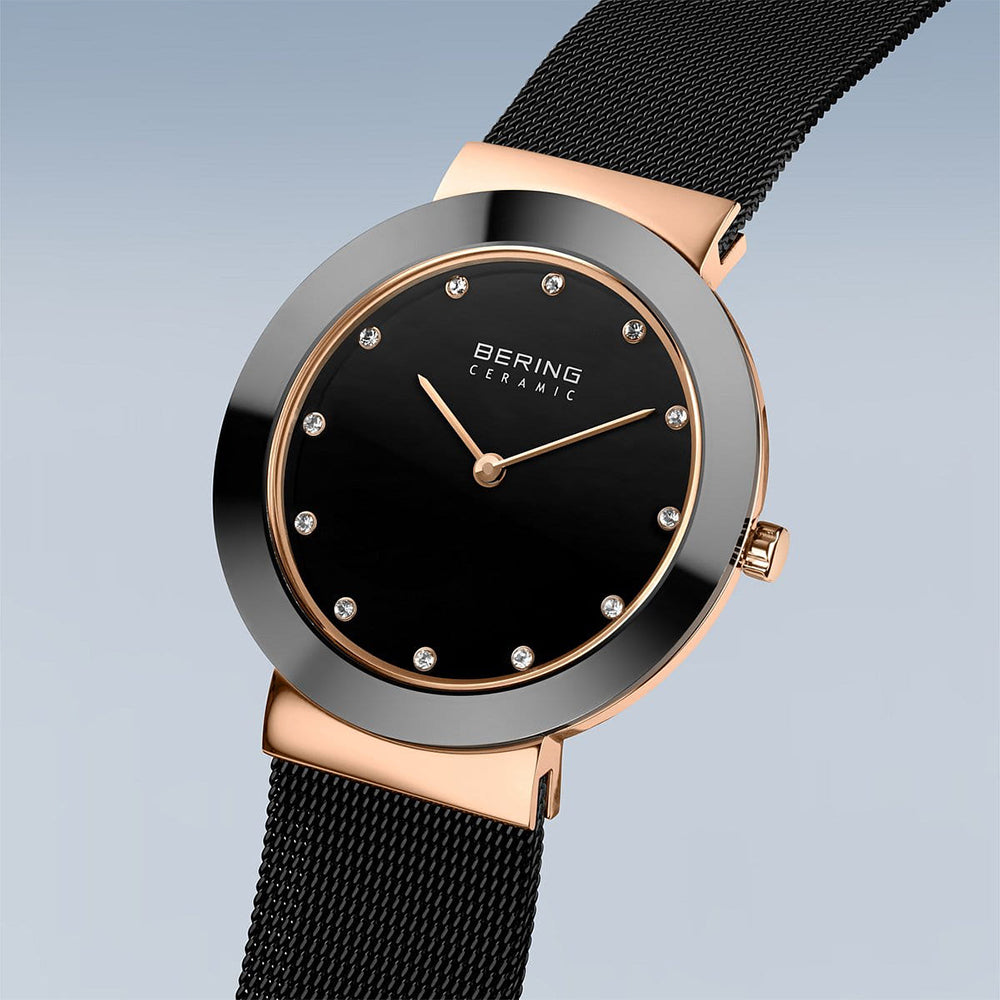 Die Bering Ceramic roségold glänzend (Artikelnummer: 11435-166) besticht durch ihre Kombination aus hochwertigem Edelstahl und modernster Hightech-Keramik. Das zarte roségold glänzende Edelstahlgehäuse wird durch die glatte „Smooth Touch“-Oberfläche des Keramiks ergänzt, das für ein besonders angenehmes Tragegefühl sorgt. Der schwarze Zifferblattton wird durch funkelnde SWAROVSKI ELEMENTS und das kratzfeste Saphirglas perfekt abgerundet. Diese Uhr vereint minimalistisches dänisches Design mit außergewöhnlicher Funktionalität und sorgt für einen zeitlos eleganten Look.