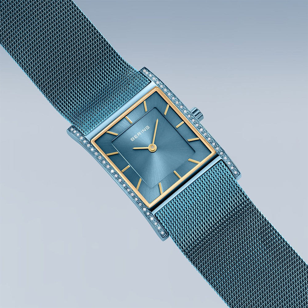 Die Bering Classic blau glänzend (Artikelnummer: 10426-398-S) ist eine elegante Damenuhr, die durch ihr blau glänzendes Edelstahlgehäuse und das Sunray-Zifferblatt besticht. Sie verfügt über ein flaches Saphirglas, das das Zifferblatt vor Kratzern schützt und gleichzeitig die Zeit stets klar ablesbar macht. Mit ihrem Quarz-Uhrwerk garantiert die Uhr eine präzise Zeitmessung. Das feine, blaue Milanaise-Armband bietet ein angenehmes Tragegefühl und ergänzt das Design perfekt. Mit einer Wasserdichtigkeit von 5 ATM eignet sich die Uhr ideal für den täglichen Gebrauch.