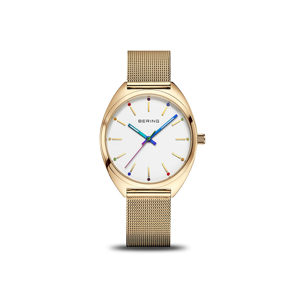 Die Bering Classic gold glänzend (Artikelnummer: 127220-36-334) vereint edles Design mit höchster Präzision. Ihr hochwertiges Edelstahlgehäuse in goldener IP-Beschichtung harmoniert perfekt mit dem stilvollen Milanaise-Armband. Das zeitlose weiße Zifferblatt mit fluoreszierenden Zeigern und bunten Indizes verleiht dieser Unisex-Uhr eine unverwechselbare Eleganz. Mit ihrem robusten Quarzwerk und dem widerstandsfähigen Saphirglas steht die Uhr für Langlebigkeit und Stil.
