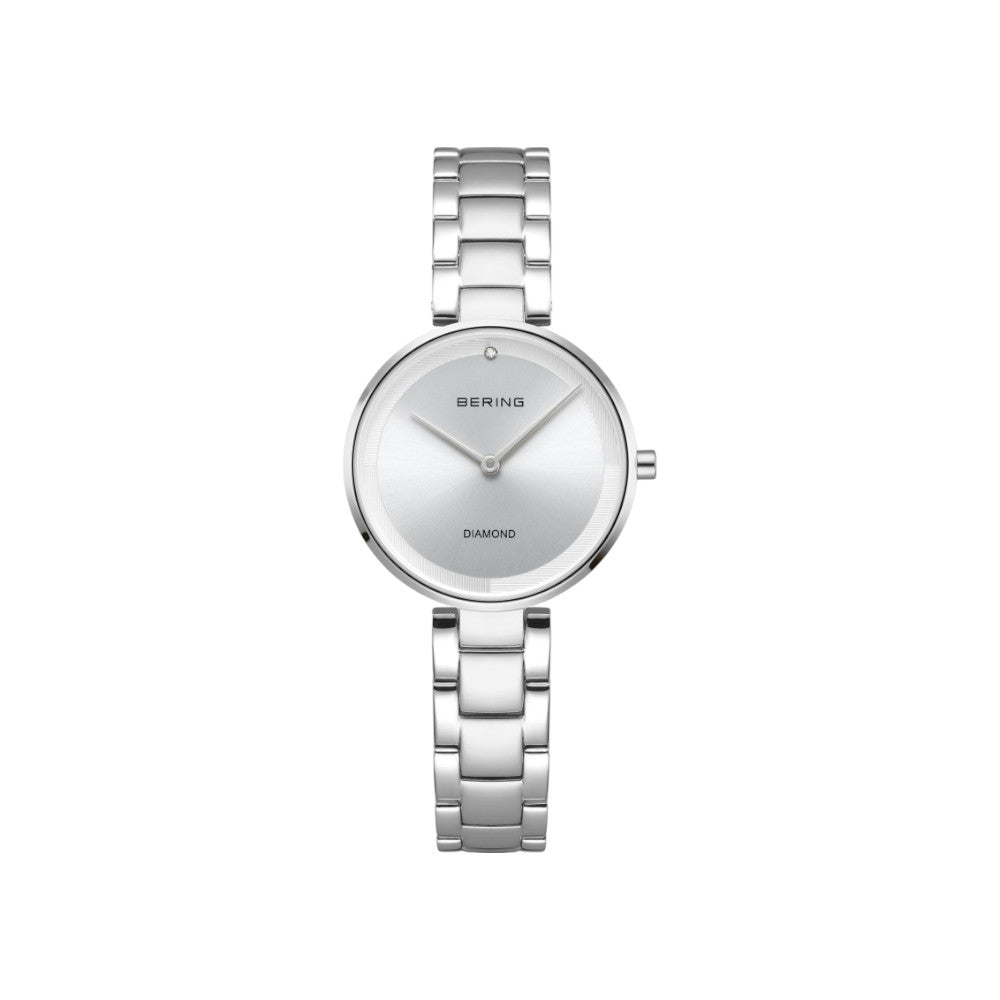 Die Bering Classic | silber glänzend | 17529-700 (Artikelnummer: 17529-700) ist eine elegante Damenuhr, die durch ihr rundes, silber glänzendes Edelstahlgehäuse und das klassische Gliederarmband überzeugt. Das 29 mm große Gehäuse und das silberfarbene Zifferblatt mit einem echten Diamanten als Akzent verleihen der Uhr eine zeitlose und stilvolle Ausstrahlung. Polierte Zeiger und kratzfestes Saphirglas unterstreichen die hochwertige Verarbeitung. Mit einer Wasserdichtigkeit von 3 bar ist diese Uhr ideal für den Alltag geeignet.