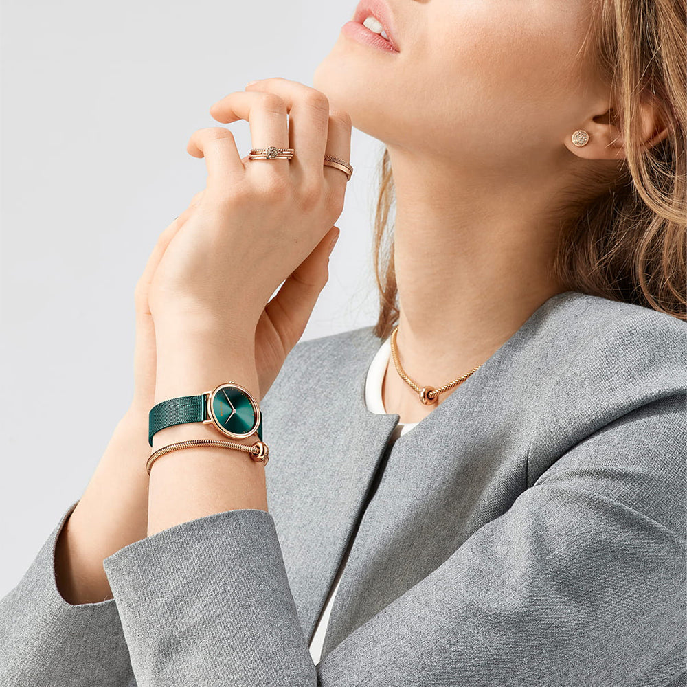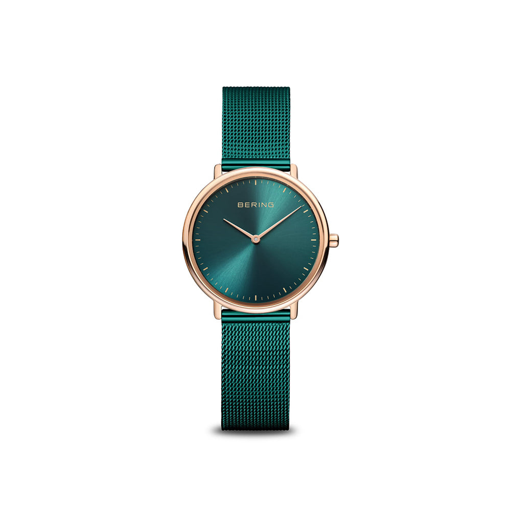 Die Bering Ultra Slim roségold glänzend (Artikelnummer: 15729-868) vereint klassisches, dänisches Design mit modernem Minimalismus. Mit ihrer schlanken Bauweise und dem hochwertigen Saphirglas setzt diese Uhr neue Maßstäbe in Sachen Eleganz. Das roségold glänzende Edelstahlgehäuse wird durch das grüne Milanaise-Armband perfekt ergänzt, was ihr eine einzigartige, zeitlose Ausstrahlung verleiht. Die Bering Ultra Slim ist nicht nur eine der dünnsten Uhren auf dem Markt, sondern auch ein wahres Meisterwerk der Uhrenkunst.