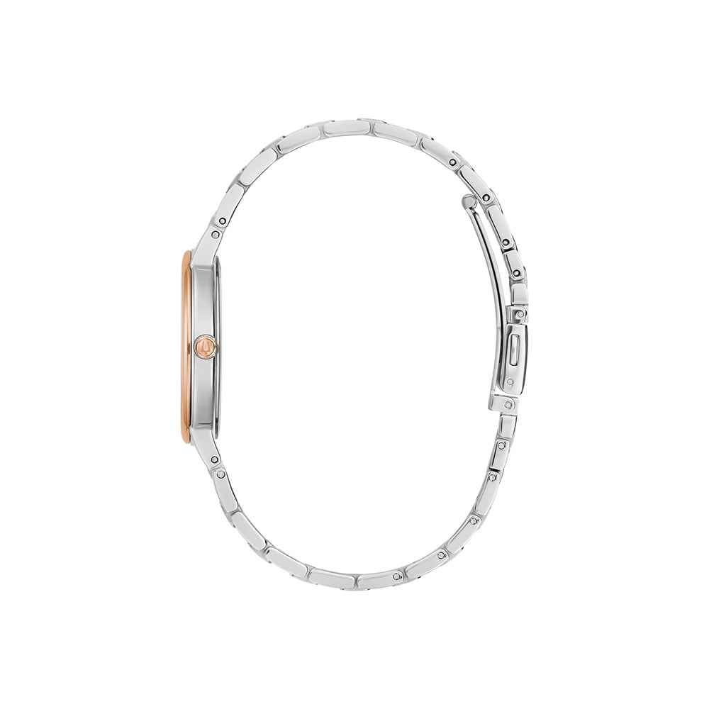 Die Bulova Classic bietet dank des fein gearbeiteten Edelstahlarmbands mit Faltschließe einen angenehmen Tragekomfort. Das Bicolor-Design in Roségold verleiht der Uhr nicht nur eine edle Ausstrahlung, sondern sorgt auch für eine besonders bequeme Passform am Handgelenk. Mit nur 6 mm Gehäusehöhe sitzt sie angenehm flach auf der Haut und ist somit ideal für den täglichen Gebrauch.