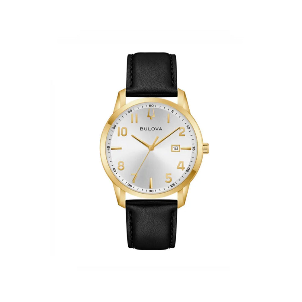Bulova Classic (Artikelnummer: 97B238) ist sie eine elegante Slim-Uhr für alle, die ein klares, luxuriös wirkendes Design mit zuverlässiger Technik kombinieren möchten. Die Bulova Classic überzeugt mit einem polierten Edelstahlgehäuse mit gelbgoldfarbener IP-Beschichtung und einem schlanken Profil von nur 7,3 mm – perfekt für ein stilvolles Auftreten im Alltag, im Business oder zu besonderen Anlässen. Das weiße Zifferblatt mit feinem Sonnenschliff wirkt hochwertig und modern, während gelbgoldfarbene Zeiger und Indizes den Look edel abrunden. Im Inneren arbeitet ein präzises Quarzwerk mit Datumsfunktion sowie Stunden-, Minuten- und Sekundenanzeige. Diese Bulova Classic ist damit die ideale Wahl für alle, die eine zeitlose Uhr suchen, die optisch überzeugt und ohne Aufwand zuverlässig läuft.