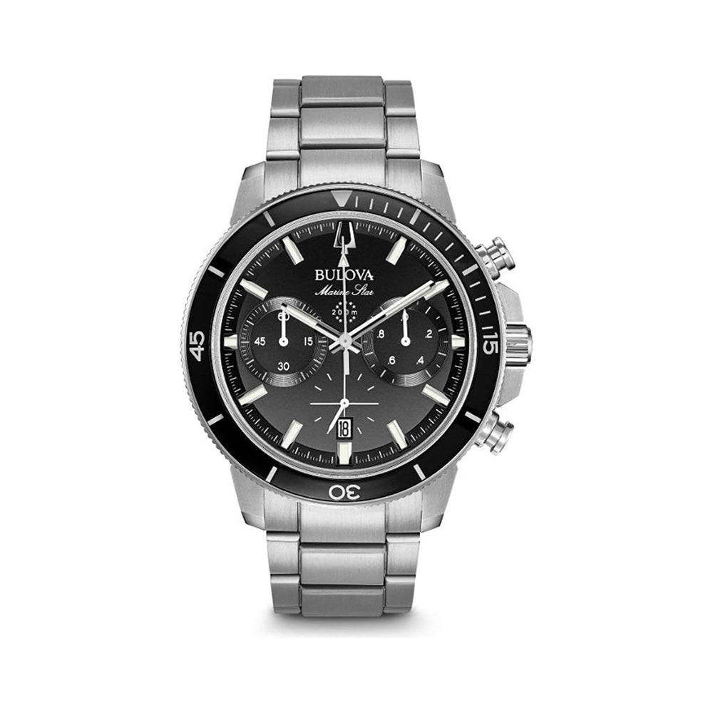 Die Bulova Marine Star (Artikelnummer: 96B272 oder 98B301) ist eine robuste und stilvolle Armbanduhr mit einem neuen Sechszeiger-Chronographenwerk und einer beeindruckenden Wasserdichtigkeit von 200 Metern. Das verschraubte Edelstahlgehäuse mit schwarzem Glaseinsatz auf der Drehlünette verleiht der Uhr eine markante Ästhetik. Mit ihrem schwarzen oder blauen Zifferblatt, leuchtenden Zeigern und Markern sowie einer praktischen Kalenderfunktion ist die Marine Star eine zuverlässige Begleitung für alle Abenteuer.