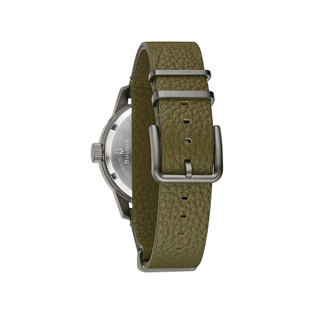 Das grüne Lederarmband der Bulova Military Uhr (Artikelnummer: 98A255) sorgt für einen angenehmen Tragekomfort und passt sich bequem dem Handgelenk an. Mit einem Gehäusedurchmesser von 38 mm und einer Höhe von 13,500 mm liegt die Uhr angenehm am Handgelenk und bietet ausreichend Bewegungsfreiheit.