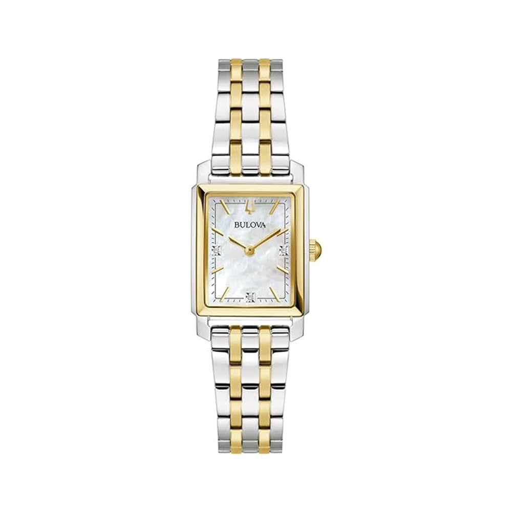 Die Bulova Sutton (Artikelnummer: 96P244, 96P245 oder 98P220) ist eine klassische Damenuhr, die mit filigranen Details und zeitlosem Design beeindruckt. Das Perlmutt-/ oder blaues zifferblatt mit Diamanten verleiht ihr eine elegante Note, während das rechteckige Gehäuse aus silberfarbenem Edelstahl für Langlebigkeit und Stil steht.