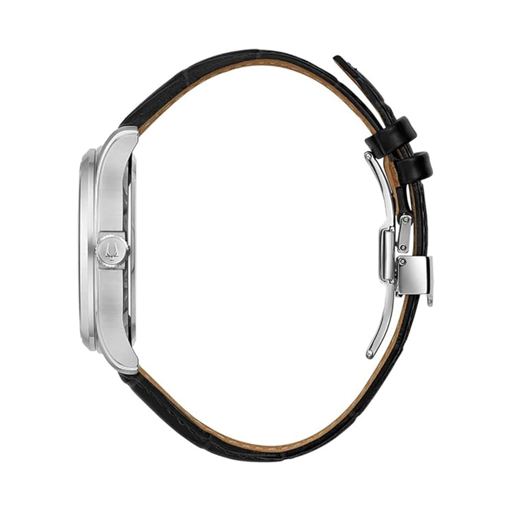 Der Tragekomfort der Bulova Wilton Uhr (Artikelnummer: 96B388, 96B389, 96B390 oder 96B391) wird durch das glatte schwarze oder braune Lederarmband und das gebogene Kristallglas gewährleistet. Ber Mit einem Gehäusedurchmesser von 41 MM und einer Höhe von 11,35 MM bietet die Uhr einen angenehmen Sitz am Handgelenk.