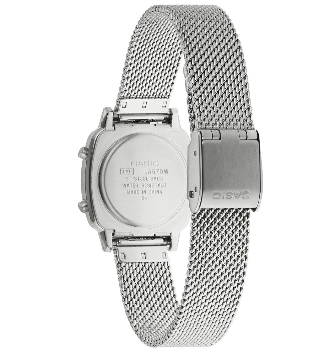 Résumé: Die Casio Collection Damen Digital Uhr LA670WEM-7EF vereint Vintage-Charme mit moderner Technologie. Mit einem filigranen Gehäuse von 25 mm, verchromtem Metall und digitalem Acrylglas-Display ist sie ein zeitloses Schmuckstück. Die dezente Farbpalette in Silber und Grau betont die Eleganz dieser Uhr. Das leichte Gewicht von 32.2 g und das komfortable Edelstahlarmband machen sie zu einem idealen Begleiter für Frauen, die Stil und Tragekomfort schätzen. Erleben Sie mit dieser Uhr die perfekte Symbiose aus Design und Funktionalität.