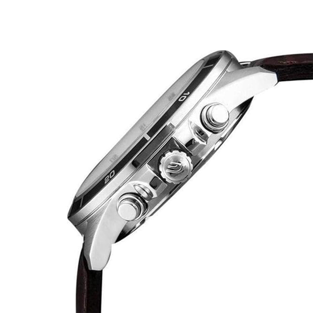 Die Casio EFR-526L-1AVUEF (Artikelnummer: EFR-526L-1AVUEF) ist eine sportliche und zugleich elegante Uhr, die Funktionalität und Stil perfekt vereint. Mit einem 43.8 mm Edelstahlgehäuse, echtem Lederarmband und kratzfestem Mineralglas ist diese Uhr sowohl robust als auch komfortabel. Die Stoppuhr mit einer Messkapazität von bis zu 59 Minuten und die Wasserdichtigkeit von 10 bar machen die Uhr zu einem idealen Begleiter für den Alltag und sportliche Aktivitäten. Das Quarzuhrwerk sorgt für präzise Zeiterfassung, während die Datumsanzeige die Funktionalität abrundet.