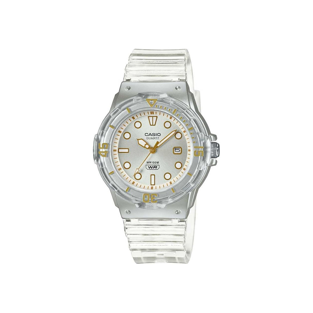 Die Casio LRW-200HS-7EVEF (Artikelnummer: LRW-200HS-7EVEF) überzeugt mit ihrem klassischen, eleganten Design und einer robusten Konstruktion. Das Gehäuse und die Lünette aus Harz sowie das klare Kunststoffarmband bieten eine stilvolle Kombination aus Leichtigkeit und Widerstandsfähigkeit. Die silberne Zifferblattfarbe, kombiniert mit Leuchtzeigern und Leuchtziffern, sorgt für gute Ablesbarkeit – auch bei schlechten Lichtverhältnissen. Mit ihrer Kalenderfunktion und einem Quarzuhrwerk bietet die Uhr zuverlässige Präzision für den Alltag.