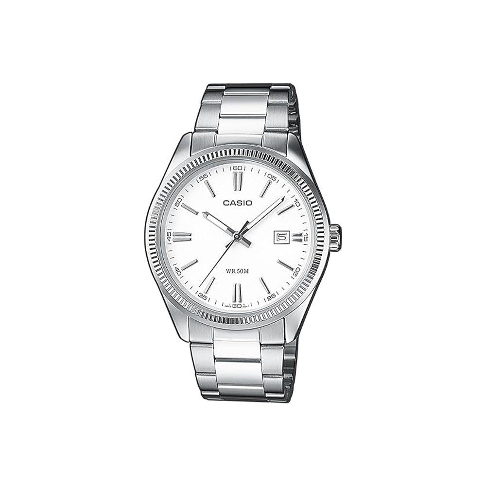 Die Casio MTP-1302PD-7A1VEF (Artikelnummer: MTP-1302PD-7A1VEF) ist eine elegante Herrenuhr aus der CASIO Collection, die durch ihre zeitlose Optik und zuverlässige Technik besticht. Mit einem Gehäusedurchmesser von 39 Millimetern und einer Armbandbreite von 18 Millimetern bietet diese Uhr ein klassisches Design, das sich perfekt für den täglichen Gebrauch eignet. Das silberne Edelstahlarmband und das weiße Zifferblatt verleihen der Uhr eine schlichte Eleganz.