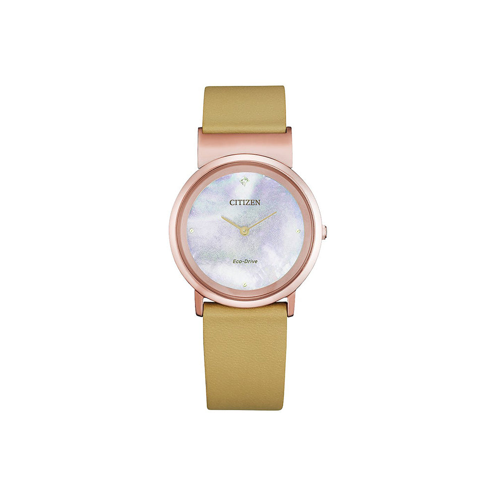 Die Citizen EG7073-16Y (Artikelnummer: EG7073-16Y) ist eine klassische Damenuhr aus der eleganten Kollektion von Citizen, die durch ihre edlen Materialien und die präzise Eco-Drive-Technologie besticht. Das goldfarbene Titan-Gehäuse in IP-Rose, kombiniert mit einem zarten, perlmuttfarbenen Zifferblatt, verleiht dieser Uhr einen zeitlosen Charme. Das Armband aus beigem Leder sorgt für einen besonders angenehmen Tragekomfort und rundet das elegante Design ab. Mit einer Wasserdichtigkeit von 5 Bar ist die Citizen EG7073-16Y sowohl stilvoll als auch funktional.