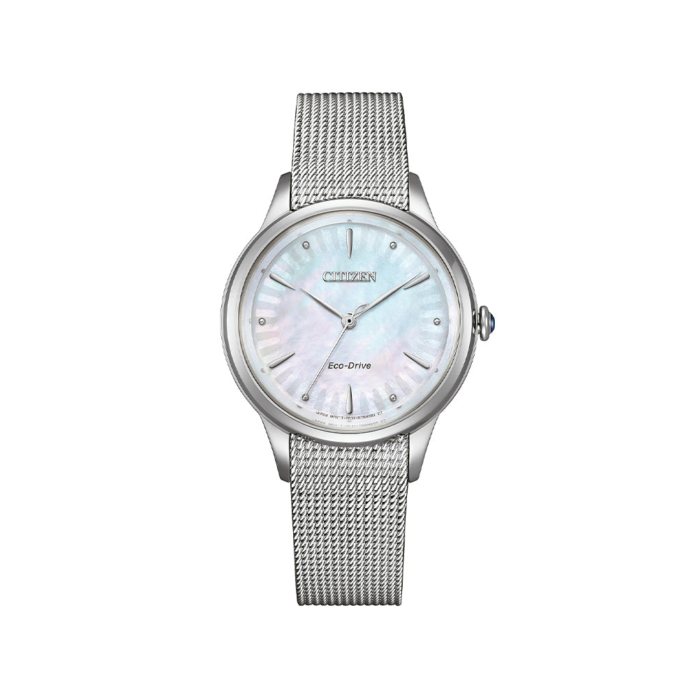 Die Citizen EM1150-86D (Artikelnummer: EM1150-86D) vereint zeitlose Eleganz mit moderner Technologie. Diese edle Uhr verfügt über ein silberfarbenes Edelstahl-Gehäuse und ein passendes Edelstahl-Armband, das zusammen mit dem mother of pearl weißen Ziffernblatt ein luxuriöses Erscheinungsbild bietet. Mit einem Durchmesser von 32 mm und einer Höhe von nur 0,7 cm ist die Citizen EM1150-86D sowohl kompakt als auch stilvoll. Die Uhr nutzt die fortschrittliche Eco-Drive-Technologie und bietet eine Gangreserve von 180 Tagen, was sie zu einem zuverlässigen Accessoire für jeden Anlass macht.