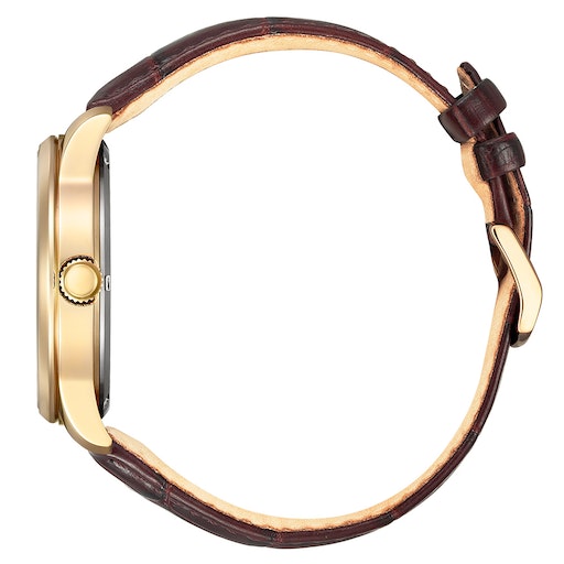 Das braune Lederarmband mit Dornschließe sorgt für einen angenehmen Tragekomfort und einen eleganten Look. Die Uhr liegt angenehm am Handgelenk und ist dank ihres geringen Gewichts von nur 59 Gramm kaum spürbar.