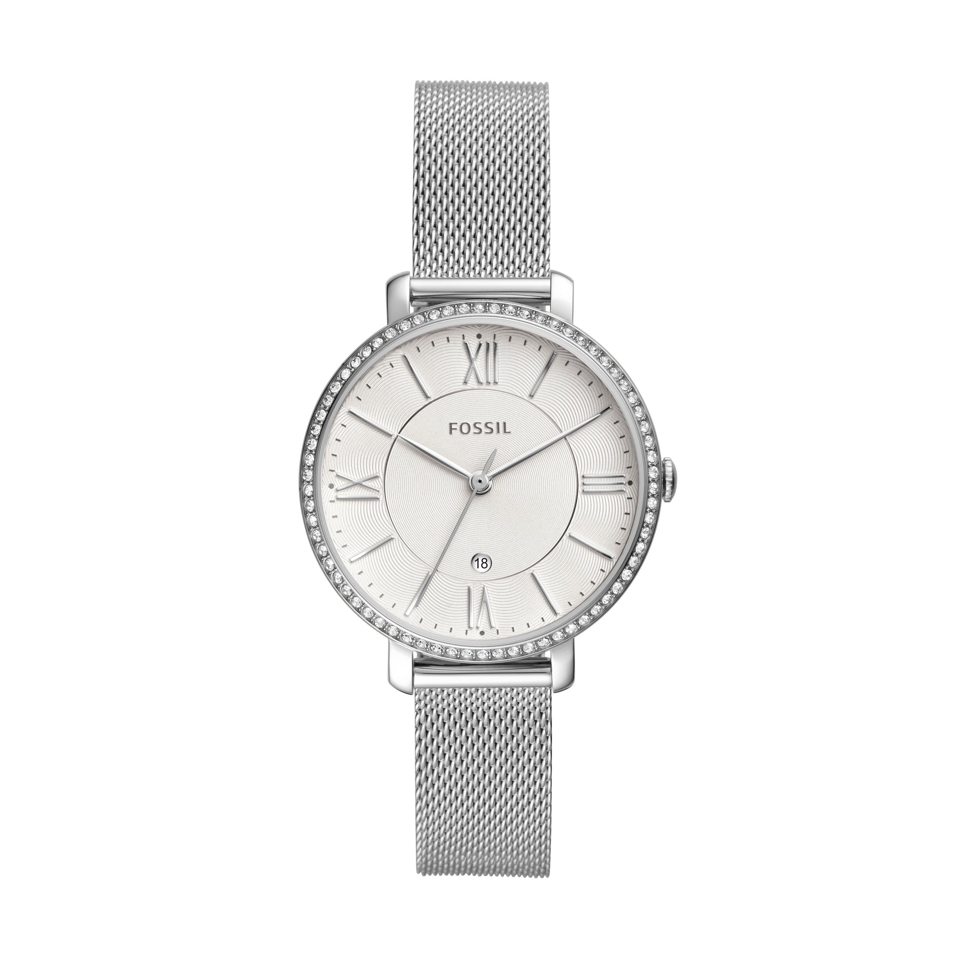Das runde Gehäuse aus poliertem Edelstahl ist mit einer Vielzahl von kleinen Steinchen besetzt, die der Uhr einen glamourösen Touch verleihen. Das milanaiseartige Edelstahlarmband ist flexibel und angenehm zu tragen. Das silberne Zifferblatt mit römischen Ziffern und der Datumsanzeige ist übersichtlich und leicht ablesbar.