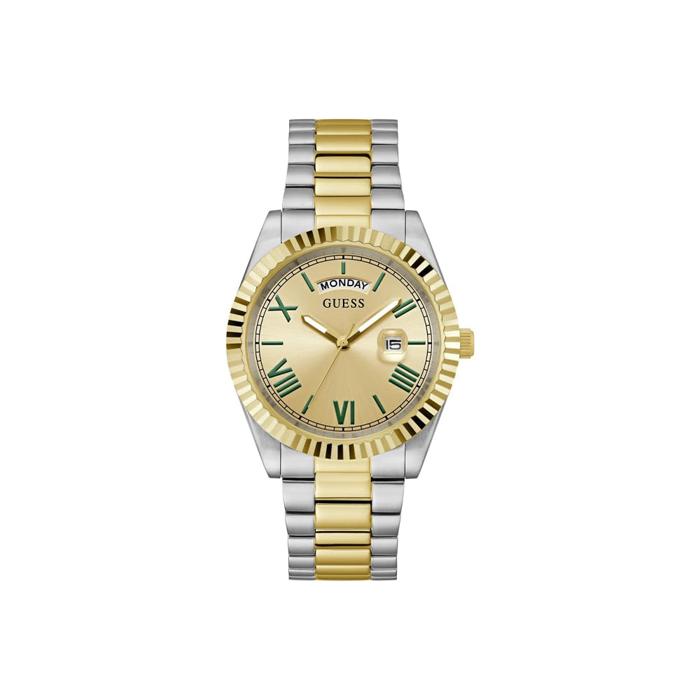 Die Guess Connoisseur ist nicht nur eine Uhr – sie ist ein Statement für Qualität, Stil und Anspruch. Mit ihrem eleganten Zusammenspiel aus goldfarbenem Zifferblatt, silbernem Gehäuse und dem zweifarbigen Armband ist sie ein Highlight für jedes Handgelenk. Durch die ausgewogene Kombination aus Design und Funktion verkörpert sie perfekt die Philosophie der Guess Connoisseur Kollektion. Wer Wert auf ein markantes Erscheinungsbild und zuverlässige Technik legt, wird mit dieser Uhr ein echtes Schmuckstück finden, das bleibenden Eindruck hinterlässt.