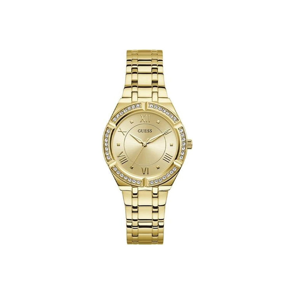 Die Guess Cosmo ist eine stilvolle Damenuhr, die modernes Design und nützliche Funktionalität auf elegante Weise verbindet. Mit ihrem goldfarbenen Zifferblatt, dem auffälligen mehrfarbigen Armband und der Tonneau-Gehäuseform setzt die Guess Cosmo stilvolle Akzente. Diese Uhr steht für modisches Selbstbewusstsein und ist ein wahres Highlight für jede Garderobe. Dank zuverlässigem Quarzwerk und durchdachtem Design ist die Guess Cosmo eine gelungene Kombination aus Fashion und Funktion – ein Muss für jede trendbewusste Frau.