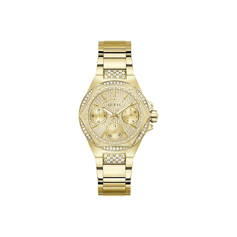 Die Guess Envy (Artikelnummer: GW0878L2) ist eine elegante Damenuhr mit einem modernen, zeitgemäßen Design. Ihr poliertes Edelstahlgehäuse in Gold und das goldfarbene Zifferblatt mit Leuchtzeigern verleihen der Uhr eine luxuriöse Ausstrahlung. Mit Funktionen wie Datum, Wochentag, 24-Stunden-Anzeige und präzisem Quarz-Uhrwerk ist die Guess Envy der perfekte Begleiter für stilbewusste Frauen.
