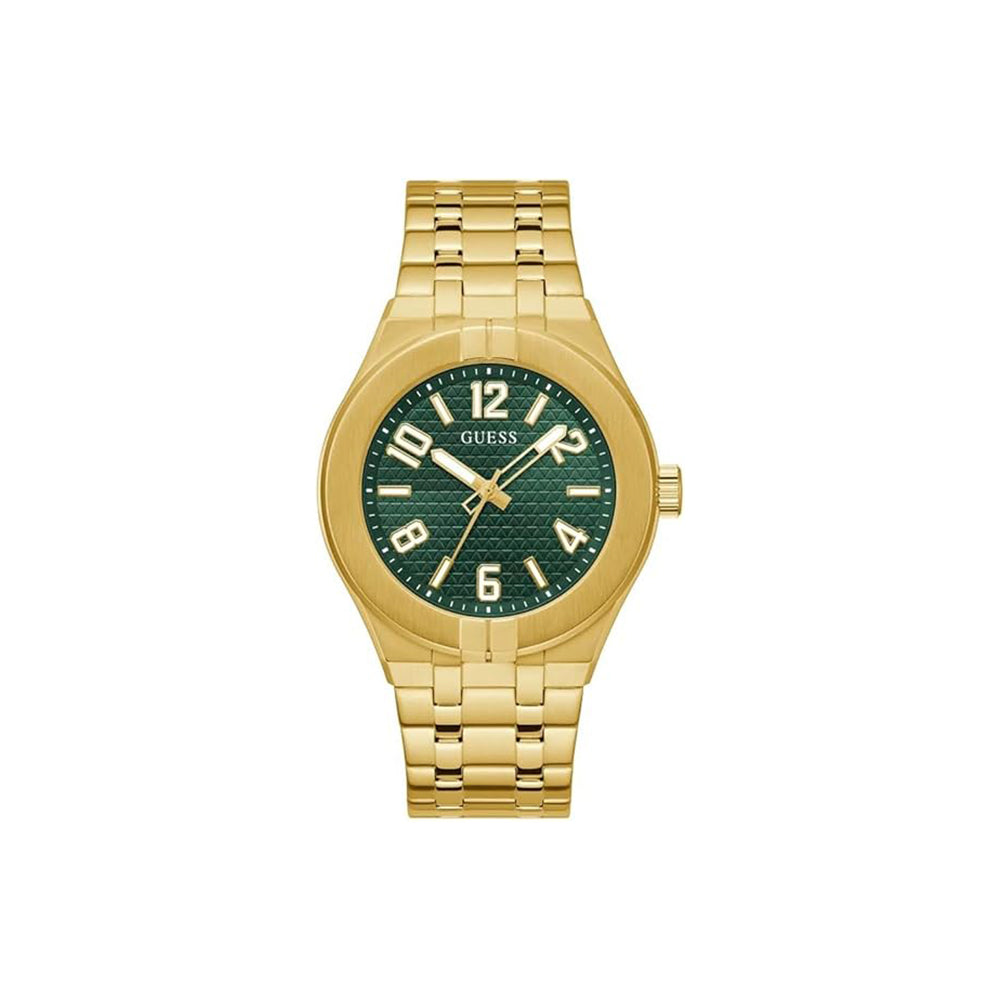 Die Guess Escape (Artikelnummer: GW0661G2) ist eine moderne Herrenuhr mit einem markanten goldenen Edelstahlgehäuse und grünem Zifferblatt. Sie überzeugt durch mattierte Oberfläche, Leuchtzeiger und eine präzise Quarzuhr mit zuverlässiger Wasserdichtigkeit von 5 ATM.