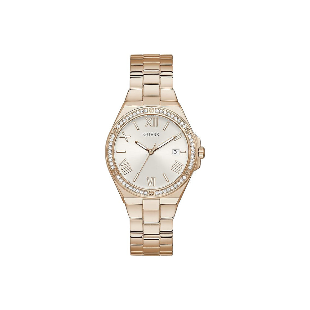 Die Guess Harper (Artikelnummer: GW0286L3) ist eine stilvolle Damenuhr, die Eleganz und Funktionalität vereint. Sie überzeugt mit einem roségoldfarbenen Edelstahlgehäuse von 38 mm Durchmesser und einem weißen Zifferblatt, veredelt mit römischen Ziffern, Indexmarkierungen und leuchtenden Zeigern. Das Quarzwerk sorgt für zuverlässige Zeitangabe, ergänzt durch eine praktische Datumsanzeige. Die Guess Harper ist das perfekte Accessoire für moderne Frauen mit Gespür für Stil und Qualität.