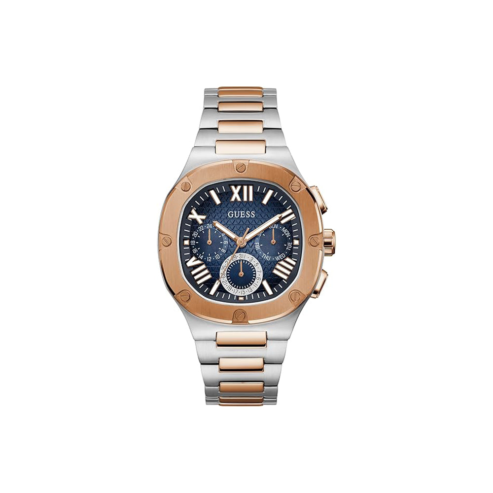 Die Guess Headline überzeugt mit ihrem unverwechselbaren quadratischen Design und der harmonischen Farbkombination aus Silber und Roségold. Die Uhr ist eine einzigartige Symbiose aus Stil, Präzision und Funktionalität, die jede Männerhandgelenk bereichert.