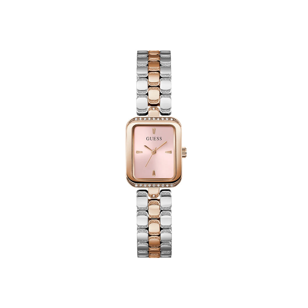 Die Guess Isla (Artikelnummer: GW0865L5) ist ein eleganter, moderner Zeitmesser mit einem rechteckigen, polierten Gehäuse aus recyceltem Stahl in Roségold-Ton. Sie überzeugt mit einem zarten, rosafarbenen Zifferblatt und einem besonderen Kristallbesatz, der diese Uhr zum perfekten Schmuckstück macht.