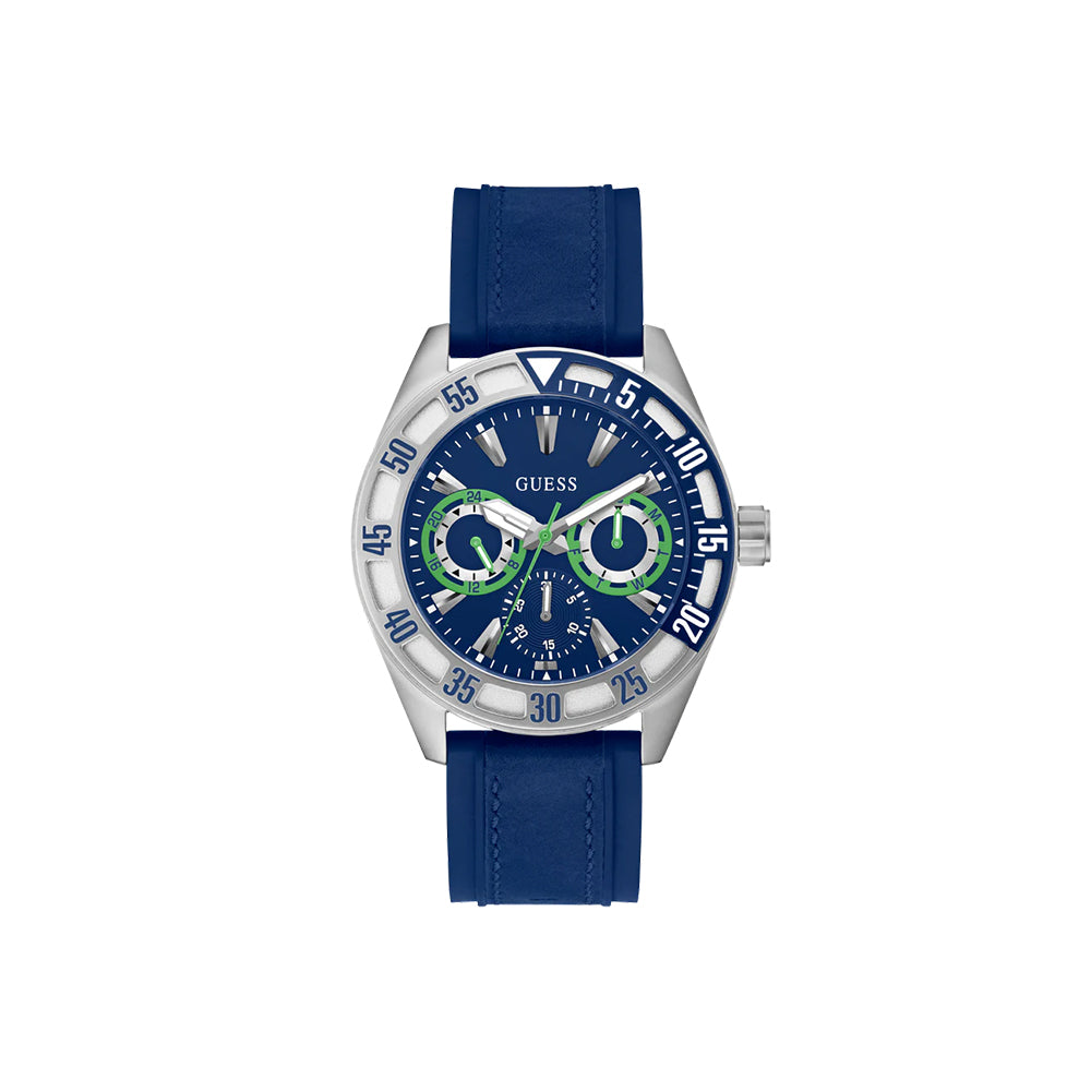 Die Guess Letterman (Artikelnummer: GW0903G1) ist ein sportlich-urbanes Statement am Handgelenk. Sie überzeugt mit einem modernen Mix aus Materialien, kräftigen Farbakzenten und einer markanten Formsprache. Das Gehäuse aus recyceltem Stahl im Silber-Ton wirkt durch das gebürstete Finish besonders maskulin. Farbige Highlights auf der Lünette und dem blauen Zifferblatt runden das Design stilvoll ab. Die Guess Letterman ist der perfekte Zeitmesser für stilbewusste Männer, die Funktionalität mit modischem Anspruch verbinden wollen.