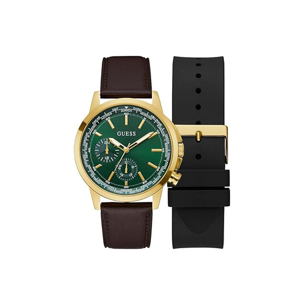 Die Guess Spec Set (Artikelnummer: GW0664G2) besticht mit einem 44 mm großen, goldfarbenen Edelstahlgehäuse und einem markanten grünen Zifferblatt. Sie verfügt über ein multifunktionales Analog-Zifferblatt und ein austauschbares, 20,3 cm langes Armband aus echtem Leder und Silikon, das vielseitigen Stil und Funktionalität bietet.