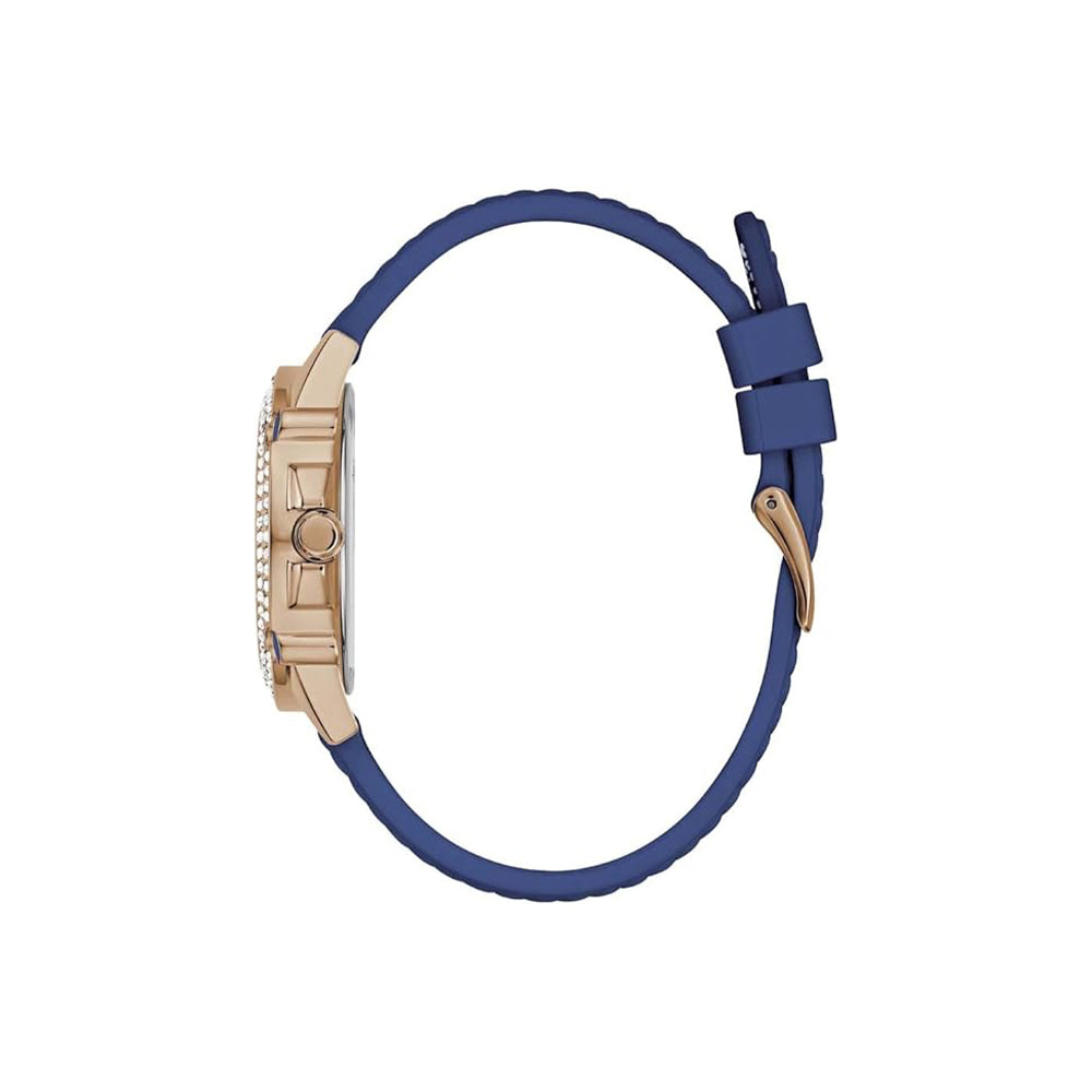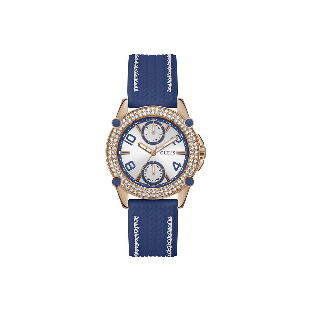 Die Guess Sport Sporty Spice (Artikelnummer: GW0554L5) ist eine perfekte Mischung aus sportlicher Dynamik und glamourösem Design. Mit einem 38-mm-Edelstahlgehäuse, einem weißen Zifferblatt und einem strukturierten blauen Silikonarmband mit Kontrastnähten bietet sie einen einzigartigen Look. Die doppelten Reihen von Kristallen und Emaille-Details verleihen dieser Multifunktions-Uhr einen besonderen Glanz.