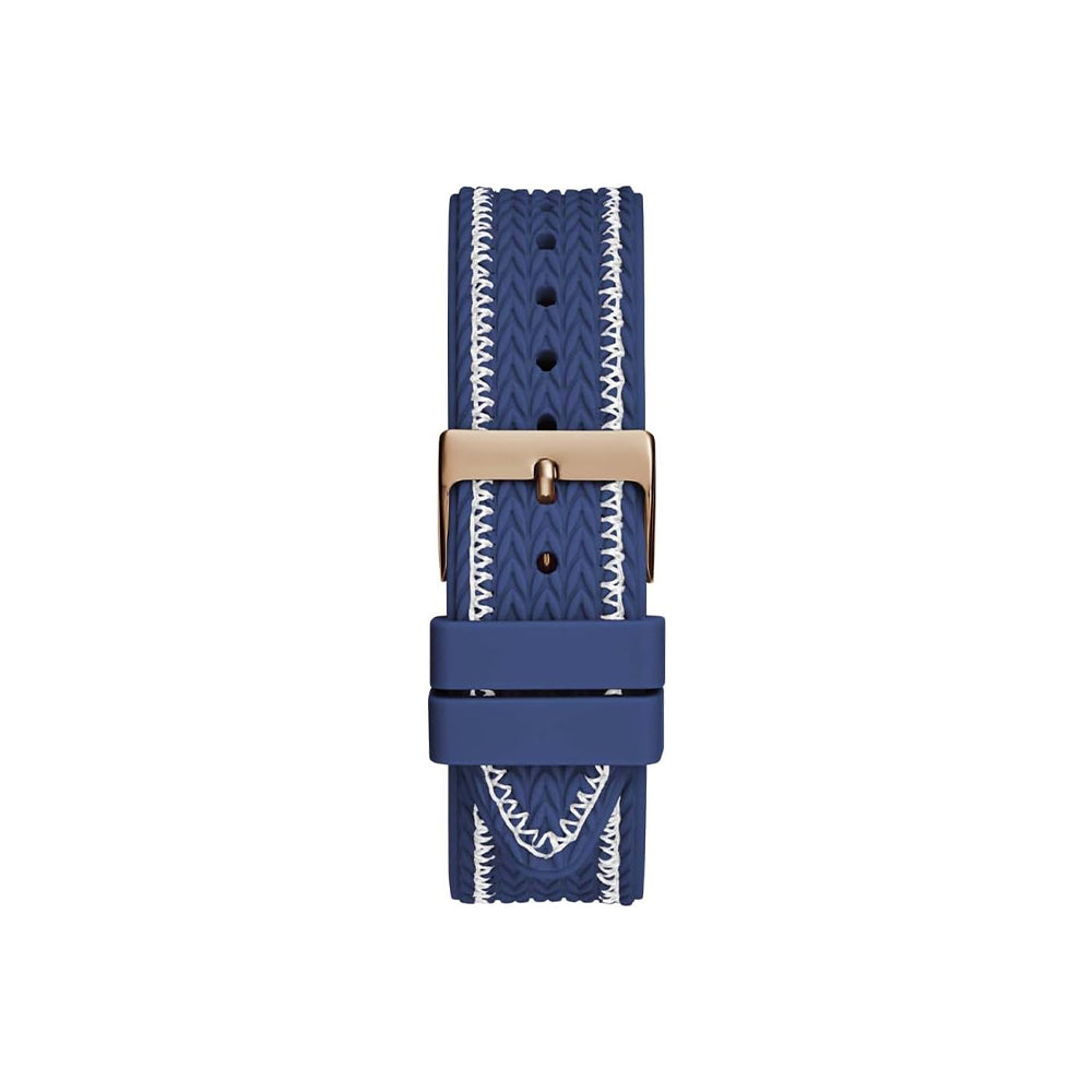 Das hochwertige Silikonarmband der Guess Sport Sporty Spice garantiert ein angenehmes Tragegefühl und eine optimale Passform. Die strukturierte Oberfläche mit Kontrastnähten sorgt für zusätzlichen Halt und Stil. Die Dornschließe ermöglicht ein einfaches und sicheres Anlegen, während das geringe Gewicht von 182 g die Uhr besonders alltagstauglich macht.