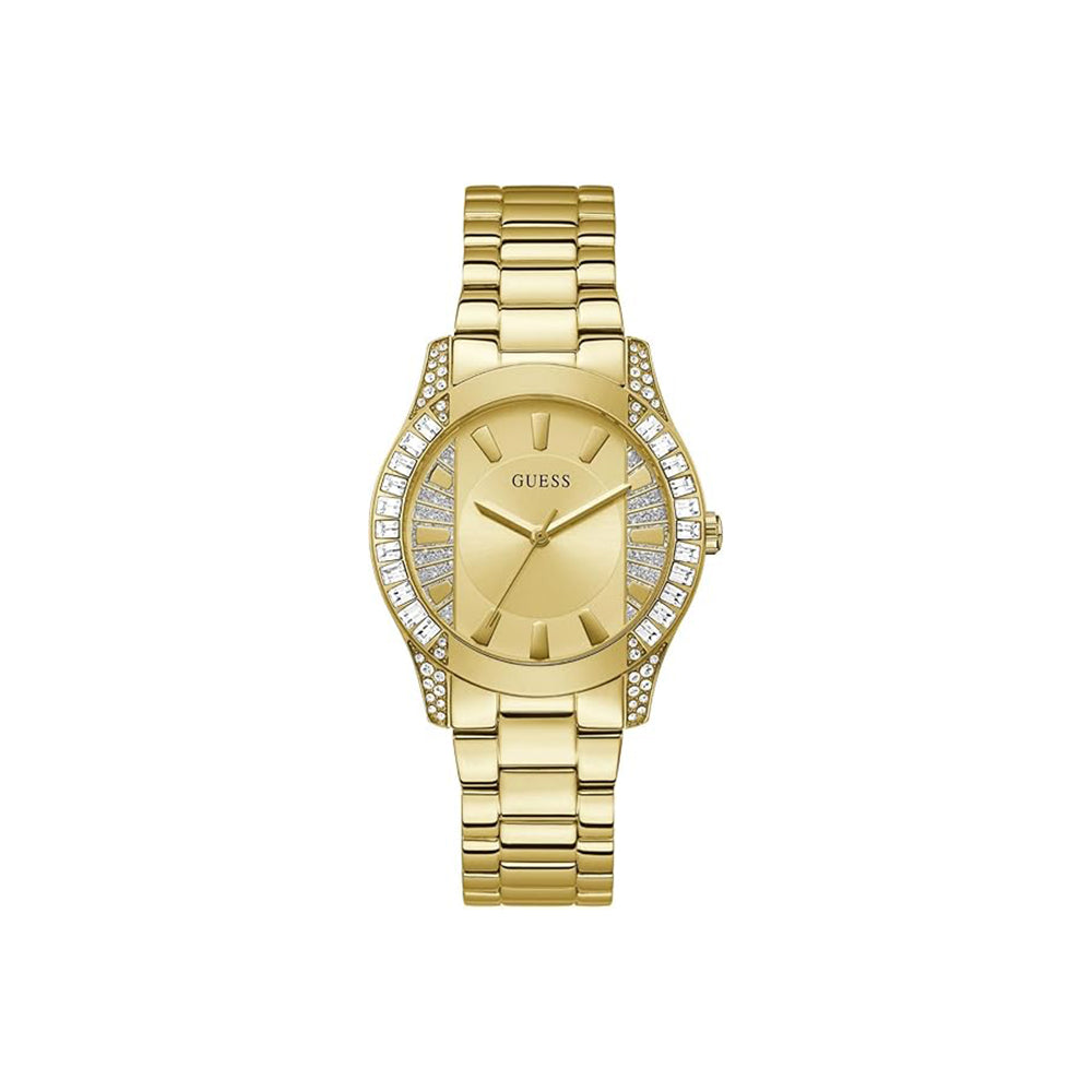 Die Guess Trend Midnight (Artikelnummer: GW0305L3) ist eine edle Damenuhr, die luxuriöses Design mit hochwertiger Verarbeitung vereint. Ihr goldfarbenes Edelstahlgehäuse, kombiniert mit einem champagnerfarbenen Zifferblatt, macht sie zu einem stilvollen Begleiter für jede Gelegenheit. Ausgestattet mit einem präzisen Quarzwerk und einem robusten Mineralglas, bietet diese Uhr nicht nur Eleganz, sondern auch Langlebigkeit.