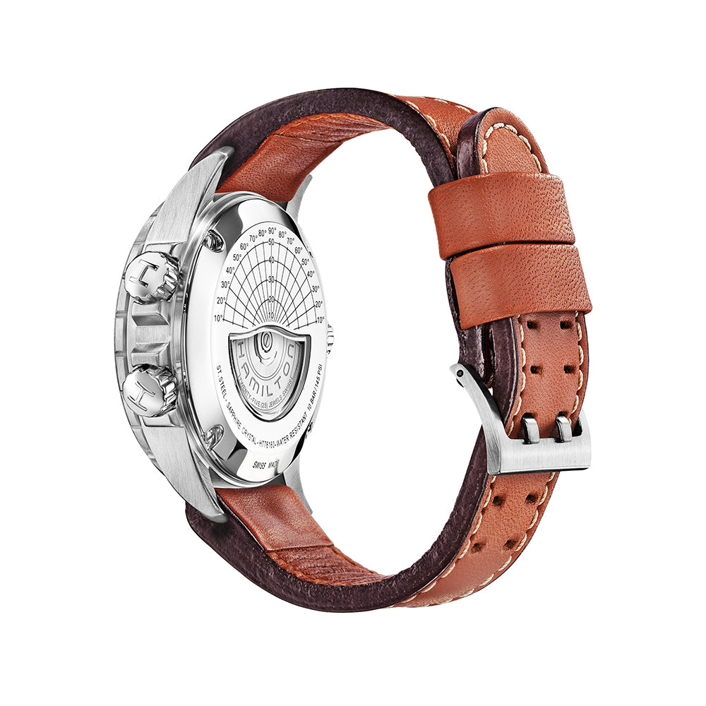 Das Rindlederarmband mit H-Buckle-Schließe bietet einen hervorragenden Tragekomfort und passt sich dem Handgelenk optimal an. Die Uhr ist auch für den täglichen Gebrauch geeignet und macht als perfekter Copilot am Boden eine gute Figur.