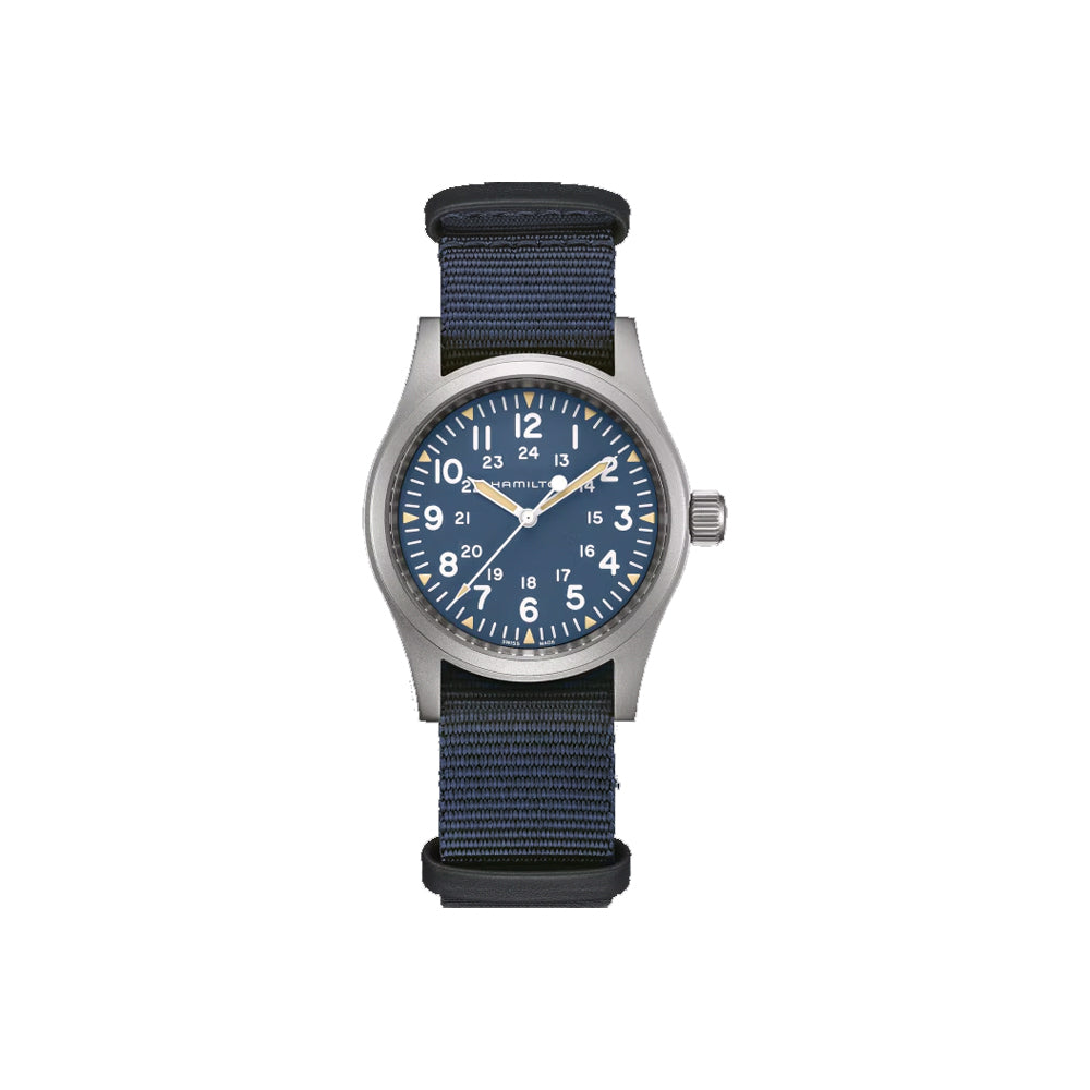 Die Hamilton Khaki Field Mechanical ist eine Hommage an das militärische Erbe und die präzise Handwerkskunst von Hamilton. Mit ihrem markanten blauen Zifferblatt, dem robusten NATO-Armband und dem langlebigen Handaufzugswerk H-50 vereint diese Uhr Stil und Funktionalität auf beeindruckende Weise. Egal, ob auf einer Mission oder im Alltag, die Khaki Field Mechanical ist ein zeitloser Begleiter, der Zuverlässigkeit und Ästhetik mühelos miteinander verbindet.