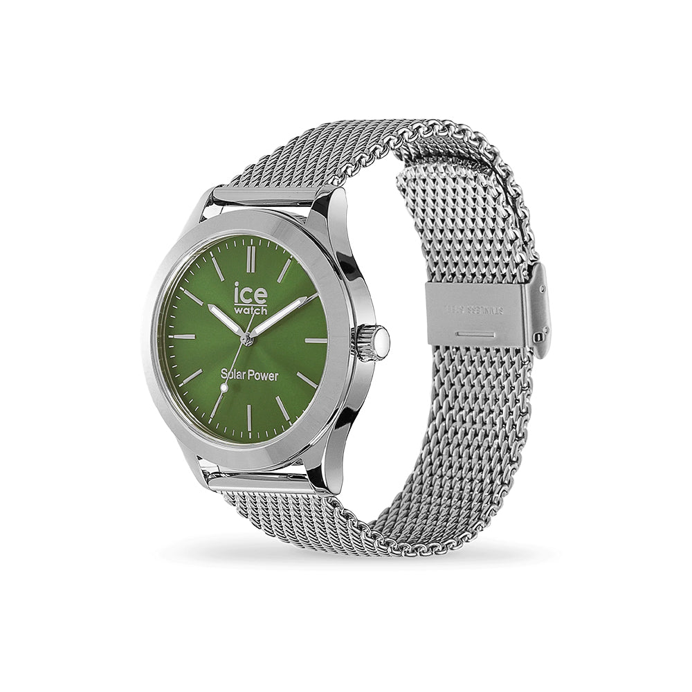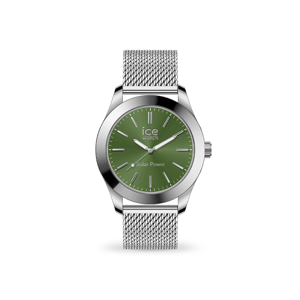 Die Ice-Watch Ice Steel Silver Green (M) ist mehr als nur eine Uhr – sie vereint umweltbewusste Technologie mit edlem Design. Das olivgrüne Zifferblatt und die silbernen Details schaffen ein harmonisches Zusammenspiel von Eleganz und Raffinesse. Das robuste Edelstahlgehäuse und das Mesh-Armband bieten sowohl Stil als auch Komfort. Dank des Solarbetriebs ist diese Uhr nicht nur umweltfreundlich, sondern auch äußerst langlebig. Mit einer beeindruckenden Wasserdichtigkeit von 10 ATM eignet sich die Uhr perfekt für all Ihre Abenteuer im Alltag.