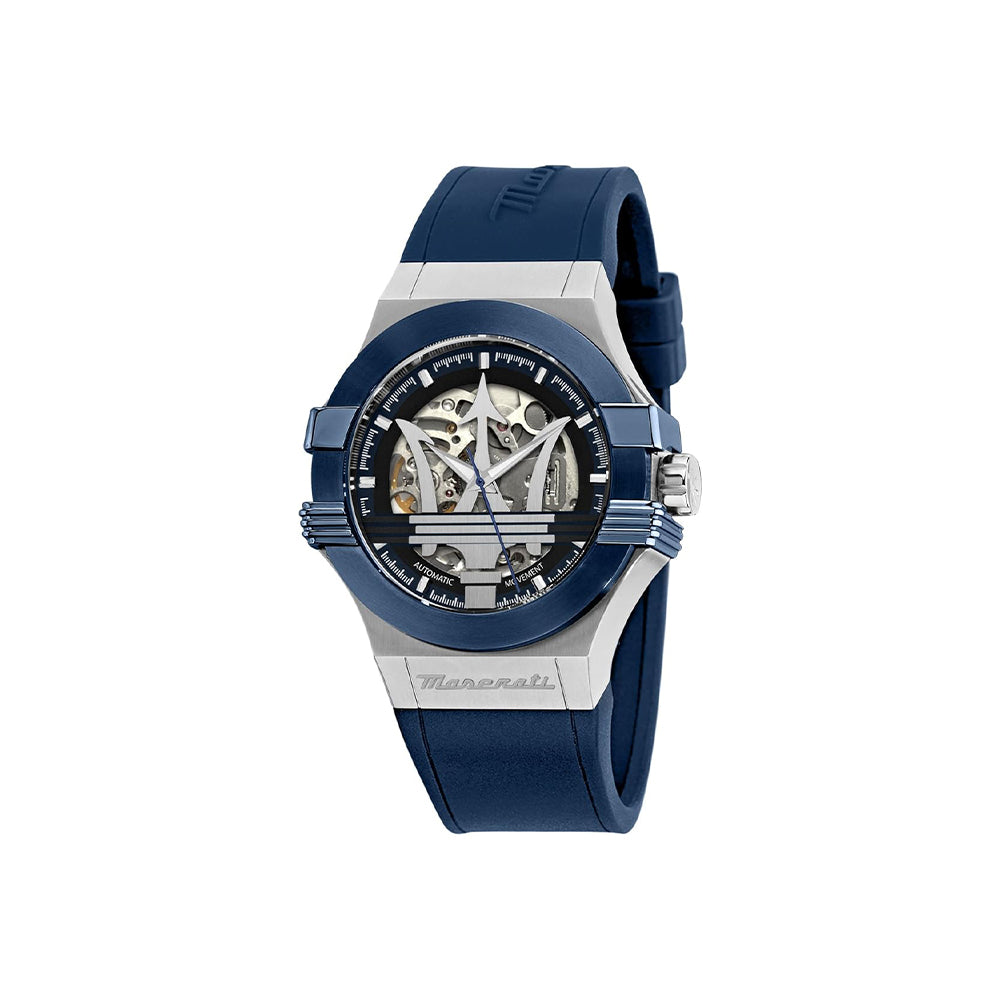 Die Maserati Potenza (Artikelnummer: R8821108035) ist eine stilvolle Herrenuhr, die das unverwechselbare italienische Design der Marke Maserati mit moderner Technologie vereint. Das Edelstahlgehäuse mit einem Durchmesser von 42 mm und das blaue Gummiarmband machen diese Uhr nicht nur zu einem optischen Highlight, sondern bieten auch hervorragenden Tragekomfort. Das präzise Quarzwerk sorgt für zuverlässige Zeitmessung, während das Saphirglas die Uhr vor Kratzern schützt. Mit einer Wasserdichtigkeit von 5 bar ist die Maserati Potenza perfekt für den täglichen Gebrauch und verschiedene Aktivitäten geeignet.