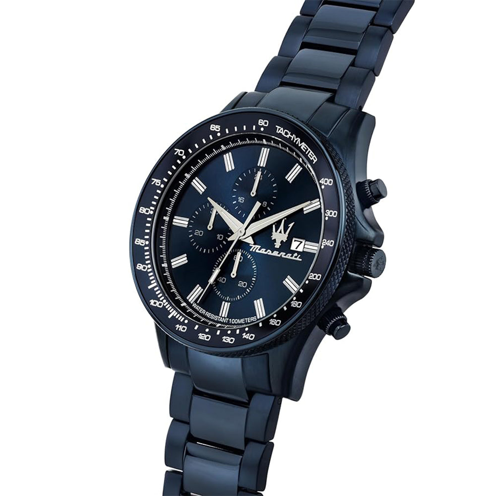 Die Maserati Sfida (Artikelnummer: 8056783056903) ist eine elegante Herrenuhr aus Edelstahl mit einem Gehäusedurchmesser von 44 mm und einer Höhe von 11,40 mm. Das blaue Zifferblatt mit drei Rotoren und Tachymeter, umrandet von Mineralglas, verleiht der Uhr ein markantes Aussehen. Mit einem präzisen Quarzwerk und Chronographenfunktionen ist sie eine perfekte Kombination aus Stil und Leistung.