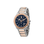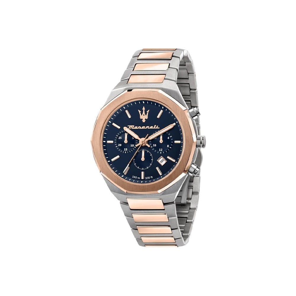 Die Maserati Stile (Artikelnummer: R8873642002) ist ein markantes Beispiel für die perfekte Verschmelzung von Luxus und Funktionalität. Diese stilvolle Herrenuhr mit einem Gehäusedurchmesser von 45 mm, gefertigt aus hochwertigem Edelstahl mit Rosegold PVD-Beschichtung, hebt sich durch ihr elegantes blaues Zifferblatt und die robuste Verarbeitung hervor. Angetrieben von einem präzisen Quarzwerk und ausgestattet mit einer Wasserdichtigkeit bis 10 ATM, bietet die Maserati Stile nicht nur eine beeindruckende Optik, sondern auch höchste Zuverlässigkeit im Alltag.