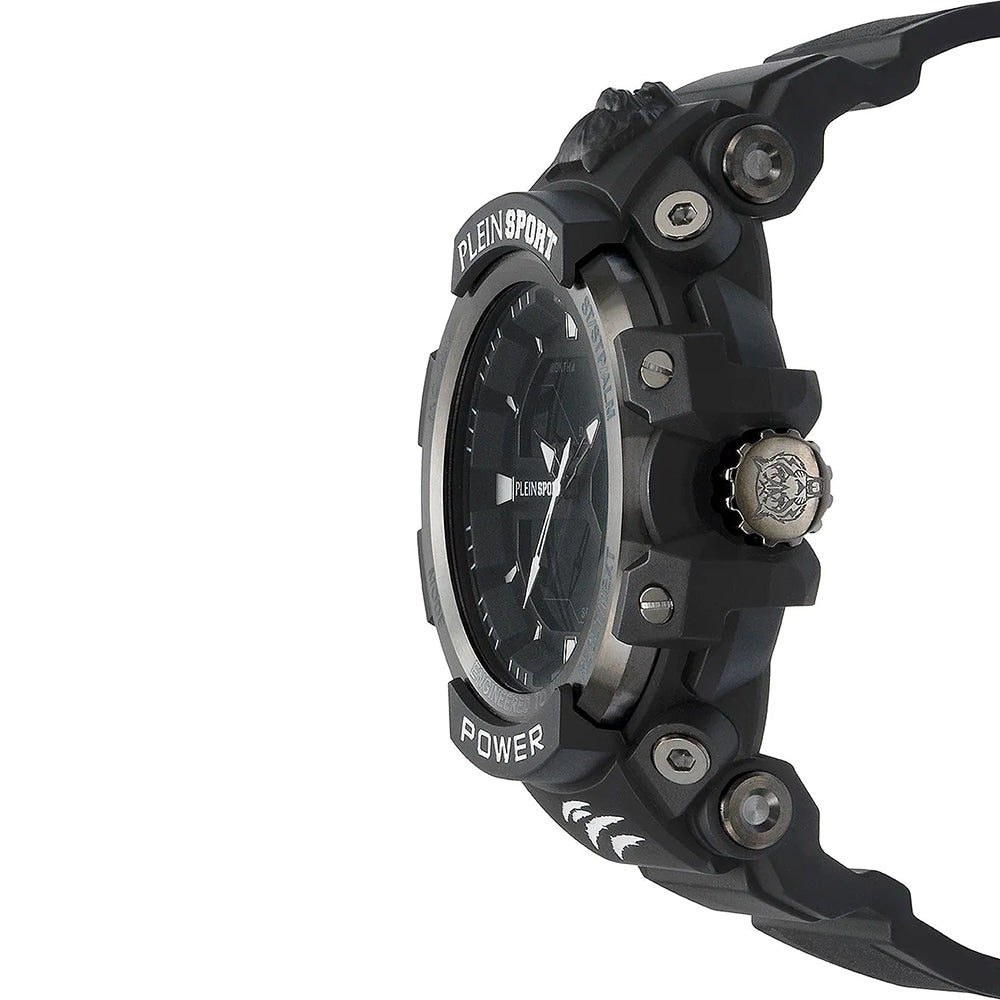 Die Philipp Plein Combat Power bietet maximalen Tragekomfort durch ihr hochwertiges Silikonarmband. Mit einer Breite von 22 mm und einer Länge von bis zu 220 mm passt sie sich optimal an das Handgelenk an. Das leichte Gewicht von nur 90 Gramm und die ergonomische Form des Gehäuses garantieren einen angenehmen Sitz, während die Dornschließe für sicheren Halt sorgt. Die robuste Bauweise und die funktionalen Elemente machen sie zu einer perfekten Uhr für den aktiven Lebensstil.Farbdetails