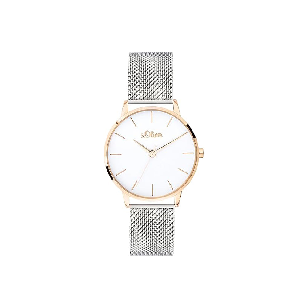 Die s.Oliver Armbanduhr mit Meshband (Artikelnummer: SO-3701-MQ) bietet eine harmonische Kombination aus modernem Design und Funktionalität. Das elegante Gehäuse in Roségold hat einen Durchmesser von 34 mm und eine Höhe von 8 mm, was diese Uhr zu einem idealen Accessoire für jede Gelegenheit macht. Auf dem weißen Zifferblatt sorgen roséfarbene Stunden- und Minutenindizes für eine optimale Ablesbarkeit. Das hochwertige silberne Meshband aus Edelstahl verleiht der Uhr einen stilvollen Look, während die Wasserdichtigkeit bis 3 ATM zusätzlichen Schutz bietet.